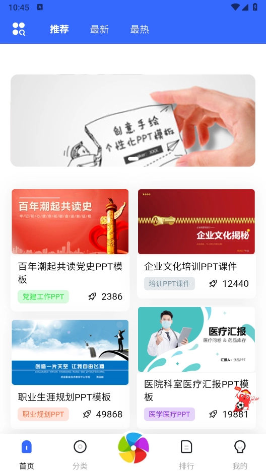 进入软件后,首页展示了海量当下热门的PPT模板资源,每个模板都标注了浏览量,方便用户参考选择使用。