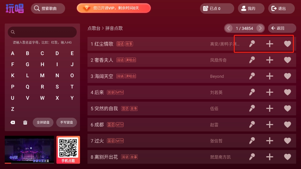 点击您想播放的歌曲,它会被添加到播放列表里。确认所选歌曲没有问题后,点击“点歌”或者“播放”按钮就可以了。