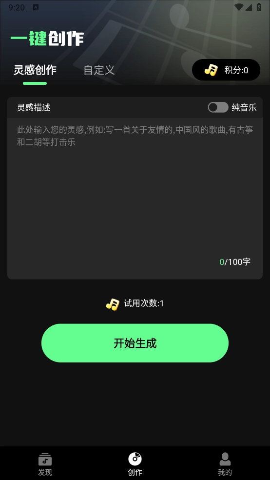 打开软件后,进入“创作”页面,你可以看到“灵感创作”和“自定义创作”两个选项供选择。