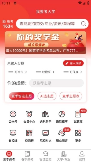 我要考大学软件是一款专为广东高考学子打造的一站式志愿填报与升学指导软件,涵盖院校简介、招生计划、历年投档分、专业详情等核心数据,助力考生精准筛选目标院校,通过智能算法,输入分数即可生成冲稳保梯度志愿推荐,让考生提前熟悉填报流程、规避滑档风险,提供高考资讯推送、院校对比、交流群互动等服务,全方位解决志愿填报信息差问题。