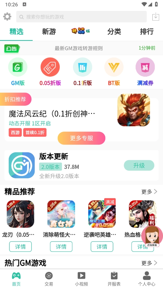 首页汇聚了海量游戏资源,涵盖GM版、0.05折版以及0.1折版等多种版本。