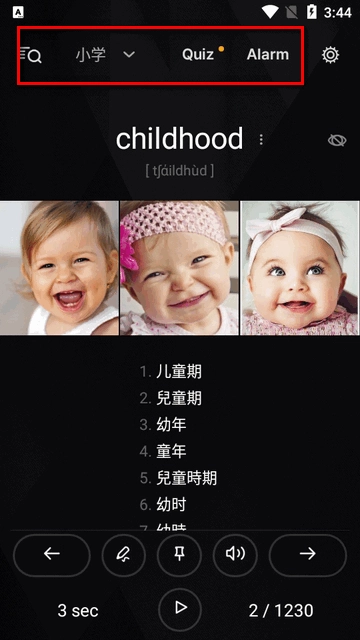 每个单词都有真人发音、翻译以及例句。