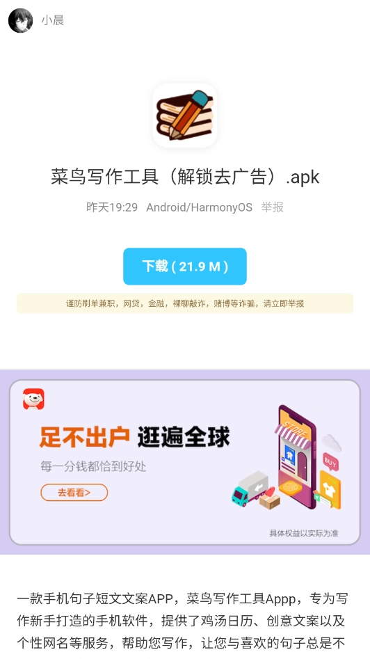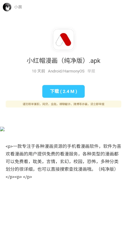 小晨软件库,是一个免费的手机软件资源分享平台,涵盖影视、小说、音乐、漫画等多种类型。这里所有软件均为免费提供,无需复杂操作,直接点击即可安装,使用起来非常便捷。而且所有软件都是正版授权,安全无毒,我们还会持续更新,为大家带来更多优质内容。