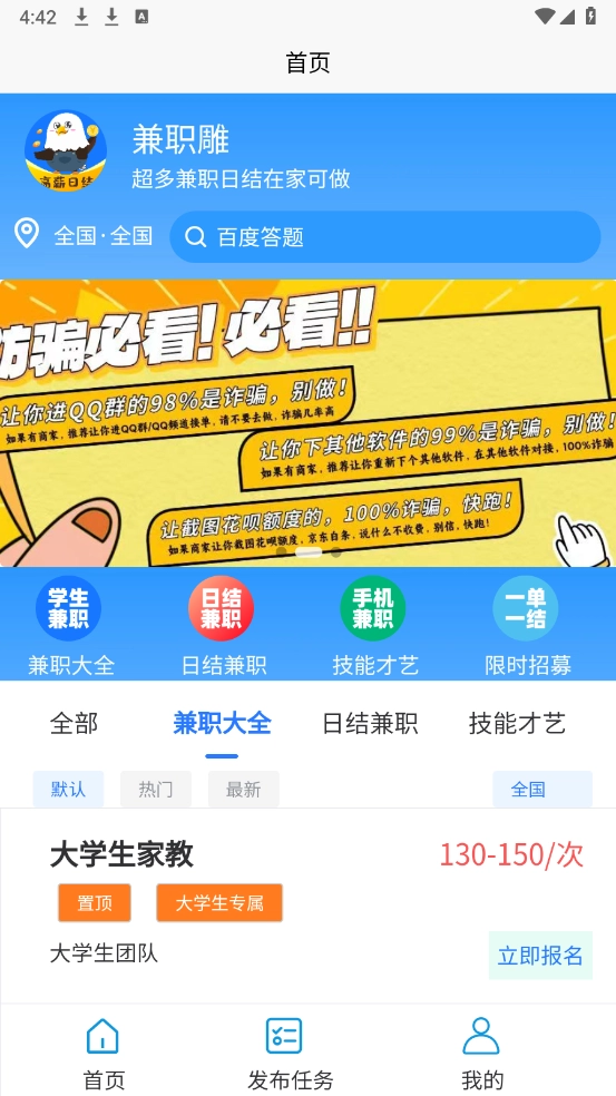 进入首页后,这里为大家提供了多种兼职类型,涵盖日结、周结和单结等不同结算方式的岗位。
