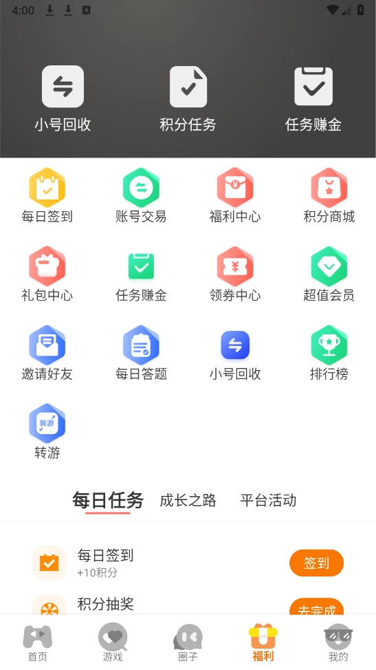 在“福利”社区里,大家能够借助每日任务、成长之路和平台活动来获取福利。