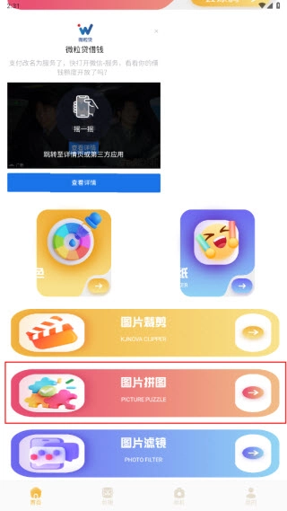 安装趣夜相机,打开。选择首页的“图片拼图”。