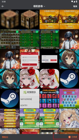 选择多张图片后,点击底部的“已完成”按钮,系统会自动拼接图片;左侧的“预览”功能可查看拼接后的效果。
