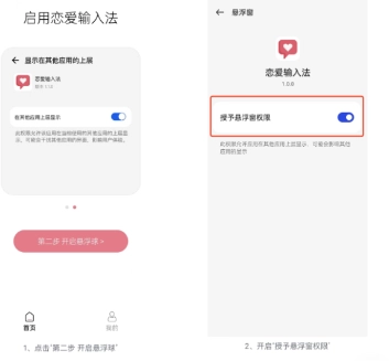 完成第一步操作后,你可以通过两种方式开启悬浮球权限:一种是从首页点击第二步的“开启悬浮球”选项,系统会直接跳转至“设置-悬浮球”页面,在该页面选择“恋爱输入法”并开启“授予悬浮窗权限”;另一种是直接进入手机设置,按照“设置-应用-应用管理”的路径找到“恋爱输入法”,点击进入应用管理页面后开启悬浮窗权限即可。