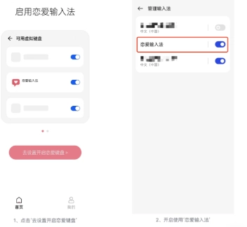 可以通过首页点击“去设置开启恋爱键盘”,跳转至设置的“管理输入法”页面开启“恋爱输入法”;也可以直接进入设置,按照“设置-其他设置-键盘与输入法-管理输入法”的路径操作开启。