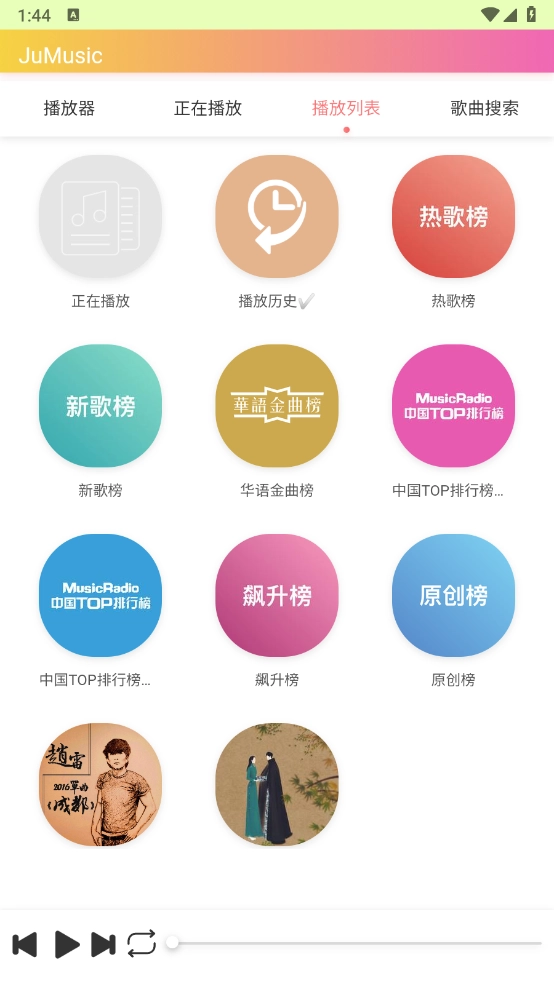 进入首页后,点击“播放列表”选项,这里汇聚了丰富的音乐资源,涵盖热歌榜、新歌榜和飙升榜等各类榜单。