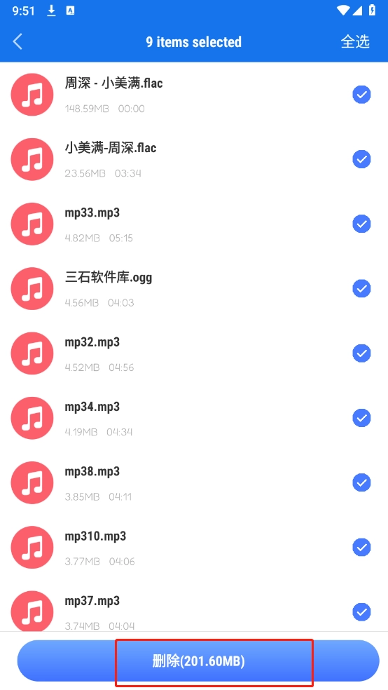 挑选需要清理的音频文件,或者点击右上角的“全选”按钮也可以。