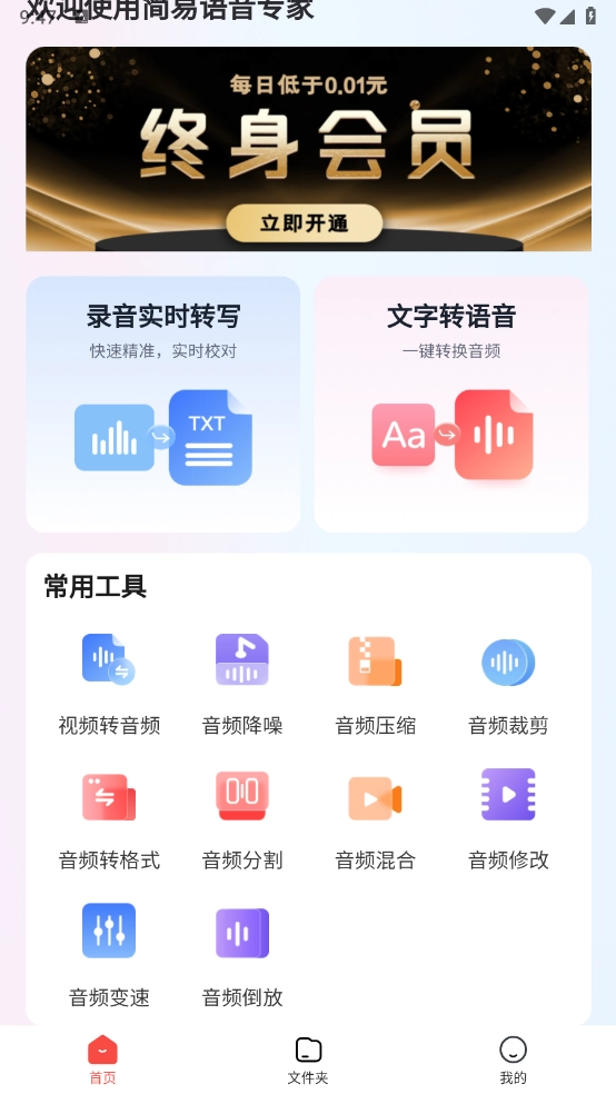进入首页后,就能看到录音实时转写功能、文字转语音功能以及常用工具板块。
