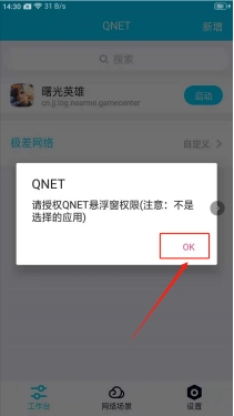 首次启动时会弹出“授权Qnet悬浮窗权限”的提示,点击ok后会跳转至悬浮窗管理界面,在该界面中开启Qnet的悬浮窗权限即可。