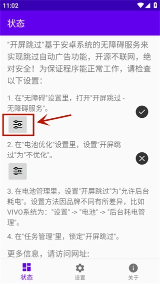 开屏跳过的首页已经给出了无障碍服务的设置指引,你只需点击图标,它会自动跳转到手机对应的设置界面,直接在已应用列表里找到开屏跳过并允许权限就可以了。