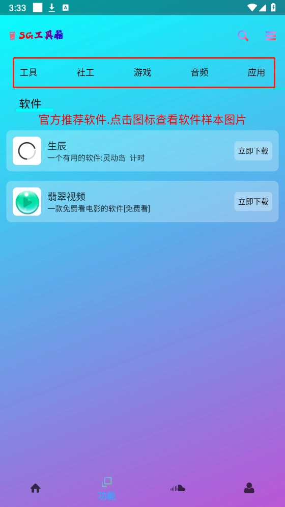 进入后,点击底部的“功能”板块,这里有非常多的类型,涵盖工具、游戏和应用等。