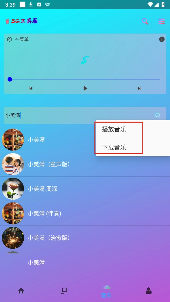 搜索之后,点击音乐,可以进行和在线播放。