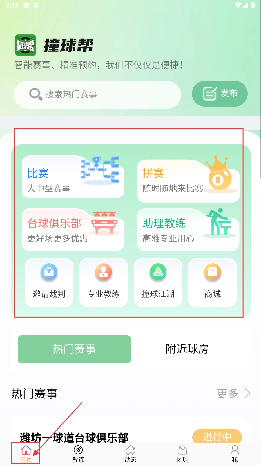 是一款专注于台球行业的综合性服务平台,依托地理位置定位与赛事管理系统,构建了集球房预订、赛事直播、教学视频于一体的全链路服务生态。该应用支持线上约战、线下对战、赛事报名等功能,覆盖全国超5000家台球俱乐部,日均活跃用户超10万,成为台球爱好者与从业者的首选工具。1、打开应用,在首页可以查看比赛、拼赛等。