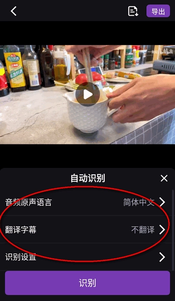 3、自动识别处选择音频原声语言,翻译字幕等内容,然后点识别。