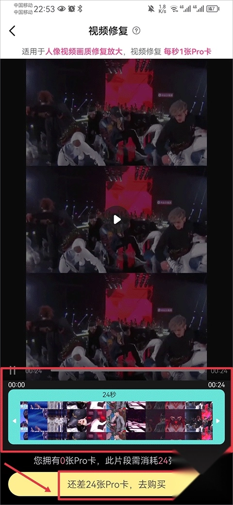 然后在相册里挑选需要修复的视频,通过拖动下方的边框就能截取视频片段,接着用pro卡完成修复操作就可以了。