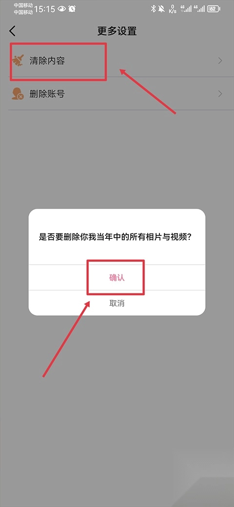 进入之后点击清除内容,接着在弹出的“是否要删除你我当年中的所有相片与视频”提示框里点击确认就可以了。