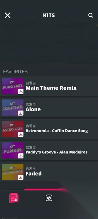 如图所示,左上角加粗的字体是音乐包的名称。若要找到所需的音乐包,只需点击KIT就能看到相关列表。