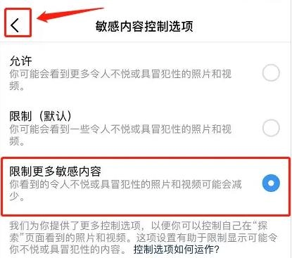 7.成功后点击【返回】,设置【限制更多敏感内容】成功