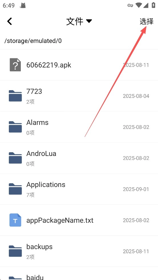 2、然后点击右上角的【选择】选中你需要压缩的文件