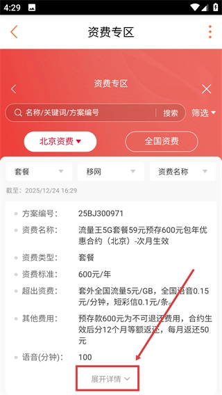 3、在资费专区界面,可选择地区(如北京资费)筛选对应区域的套餐,点击【展开详情】能查看套餐的完整资费信息。