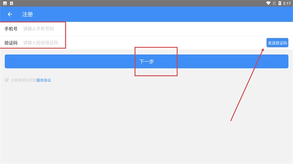 3、在注册页,先输入【请输入手机号码】,点击【发送验证码】获取短信,填写后点击【下一步】继续注册。