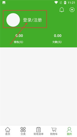 进入个人中心页面后,点击页面上方的【登录/注册】区域,就能跳转到登录界面,同时该页面还展示着钱包、欠款等信息模块。
