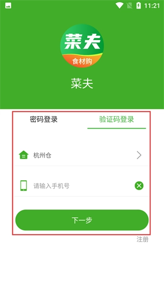 当切换到验证码登录方式时,先选定对应的仓库,接着在【请输入手机号】处填写号码,然后点击【下一步】按钮,就能进入获取验证码的环节了。