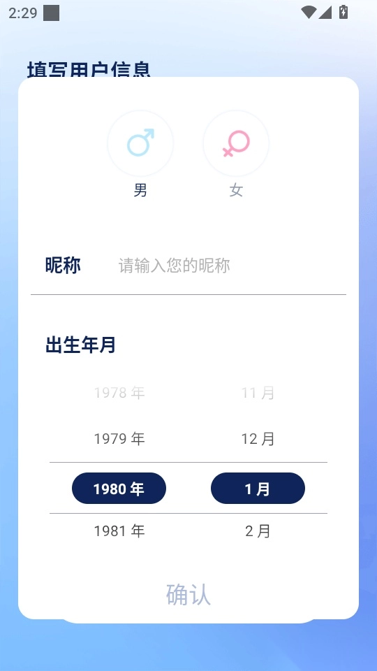 3. 接着填写昵称并选择出生年月,随后点击“确定”按钮,即可进入下一步操作。