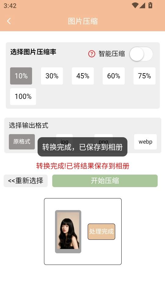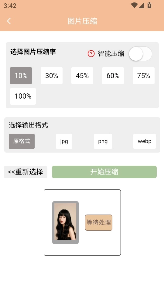 6.从相册导入图片后,选定图片的压缩分辨率与输出格式,随后点击“开始压缩”按钮,即可进入后续操作步骤。