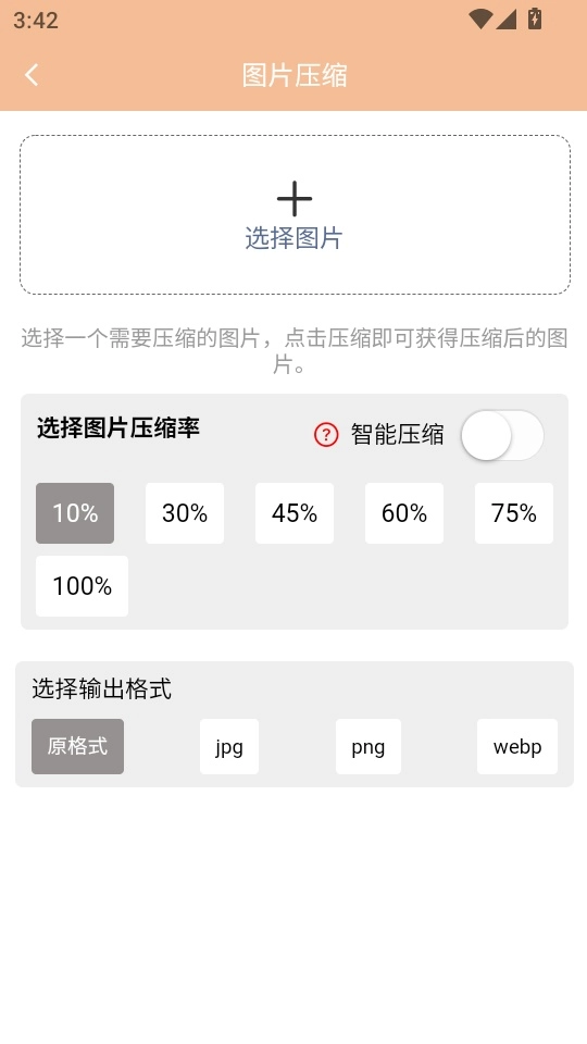 4. 进入“图片压缩”功能菜单界面后,点击“选择图片”按钮以进入下一步操作