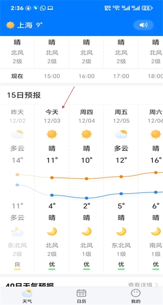 打开软件主界面后,找到上海的15日预报区域,这里展示着未来多日的天气变化趋势。点击“今天”这个选项,就能进入到当日天气的详细信息页面。