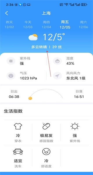 进入今日天气详情页面,查看气温、天气状况,以及紫外线、气压等数据,还有对应的生活指数信息。