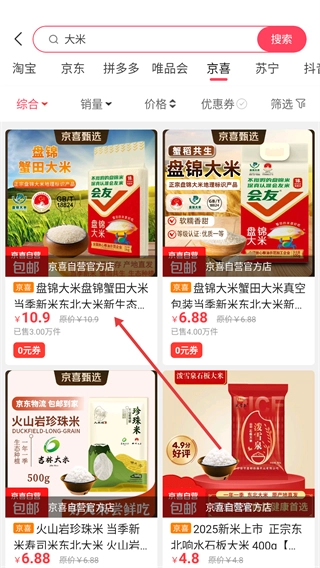 在京喜平台的商品列表里,能够查看盘锦大米这类商品的价格、销量等信息,进而挑选出想要的商品。
