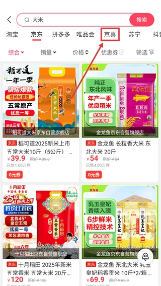 在搜索结果页面选择【京喜】平台分类,随后切换到该平台下的大米商品列表。