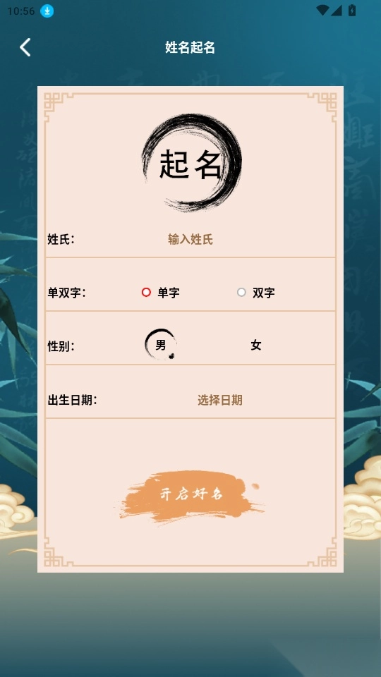 3. 输入姓氏时选择单字或双字形式,接着选定性别、日期,随后点击“开启好名”按钮,即可进入下一步操作。