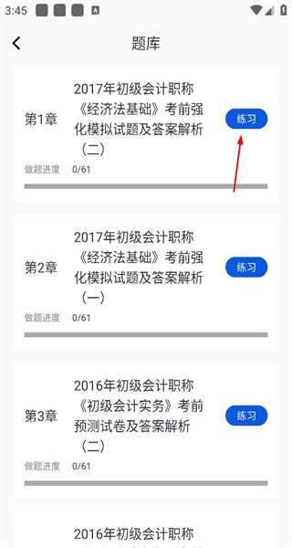 进入章节练习对应的题库页面后,系统会展示初级会计职称各章节的模拟试题,每道题目旁都配有练习按钮,其中第1章对应的练习按钮为指引指向的目标。