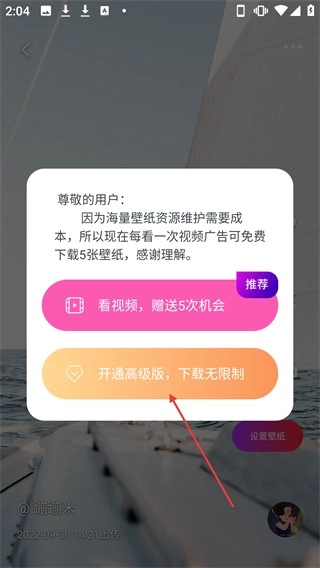 在弹出的窗口里,你可以选择【开通高级版,无限制】这一选项,以此来获取壁纸权限。