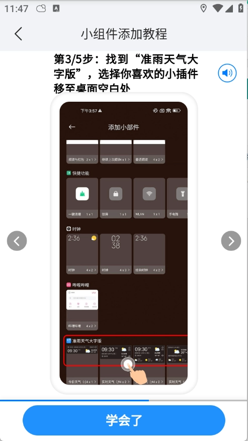 找到“准雨天气大字版”应用,挑选你心仪的小插件,将其移动到桌面的空白区域。