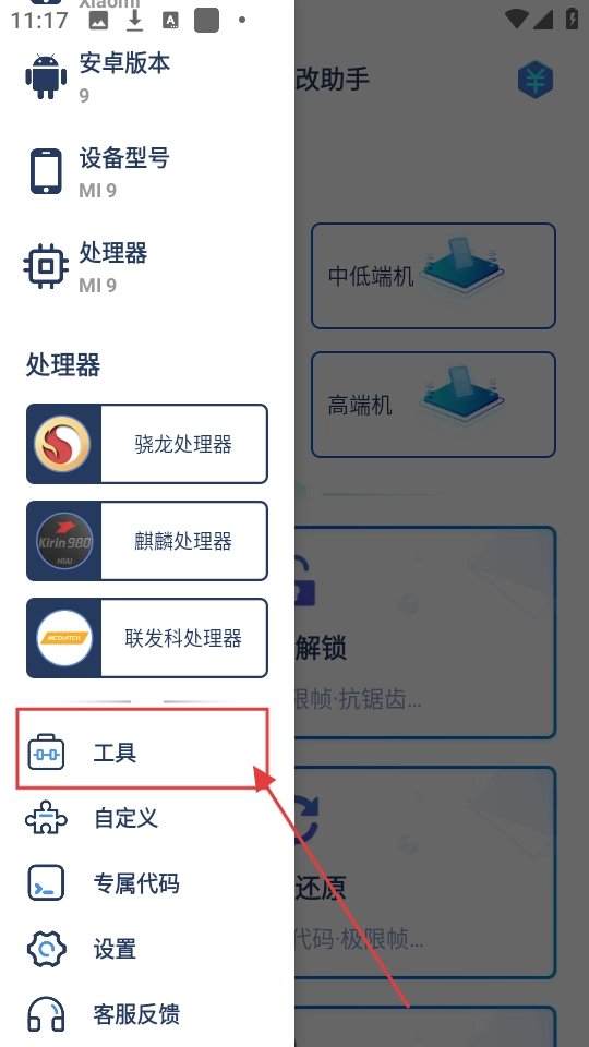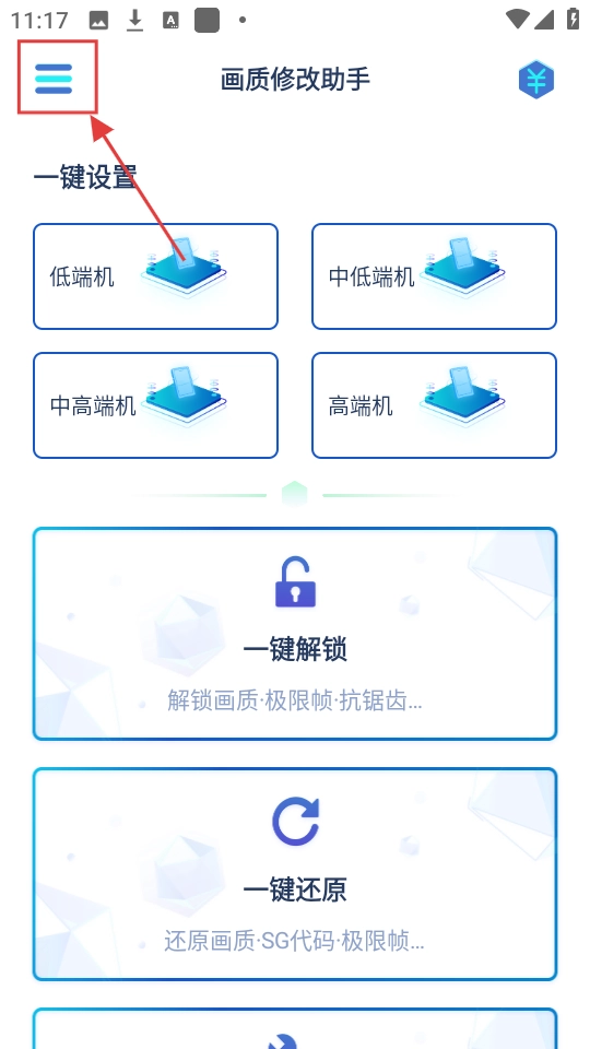 打开画质修改助手后,若想查找工具,可点击左上角的菜单按钮,展开菜单浏览即可。