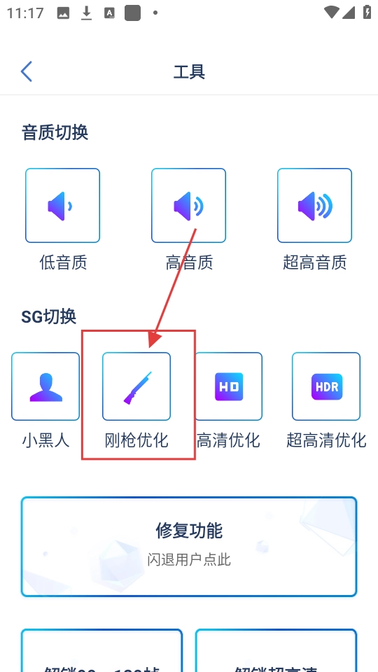 进入工具页面后,就能找到SG切换的相关选项。要是你希望开启刚枪优化功能,直接点击【刚枪优化】这个选项就可以了。