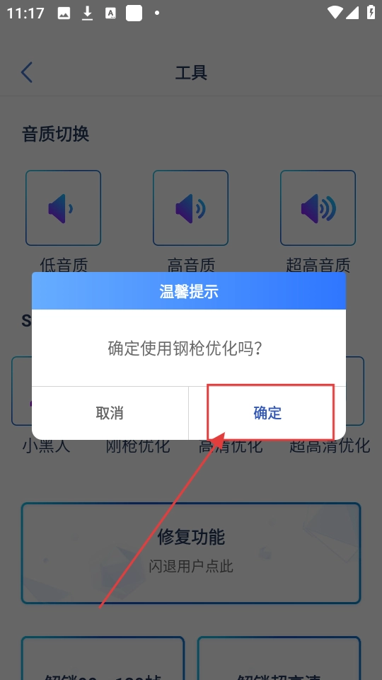 点击后会弹出温馨提示,询问是否确定使用刚枪优化,点击【确定】按钮,即可开启优化功能。