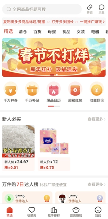 多多团长是一款兼具省钱购物与分享赚钱功能的综合应用。它借助拼多多强大的供应链和商品资源,严选海量高性价比的优质商品,为用户打造一站式购物体验。用户既能在平台上以更优惠的价格选购商品,又能通过分享商品链接或邀请好友加入,获取佣金和奖励,达成自购省钱、分享获利的双重目的。平台每日更新大量优惠券,用户购物前可领取,享受更低价格;众多商品还能叠加红包与优惠券双重抵扣,让用户以更划算的价格买到心仪好物。此外,平台提供分类查询和搜索功能,方便用户快速找到目标商品并完成下单。