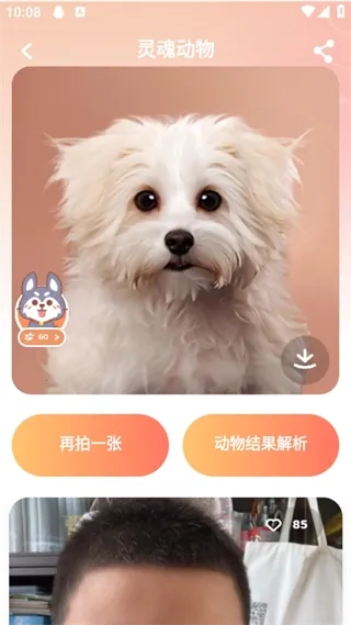 拍摄完成后,系统会自动识别并调整形象,把照片转化为带有个人特色的小动物形象。要是想保存的话,点击右下角的按钮就行。