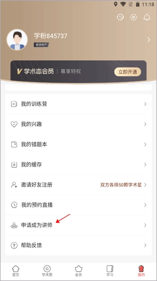 1、注册登录后,进入我的个人板块,点击“申请成为讲师”。