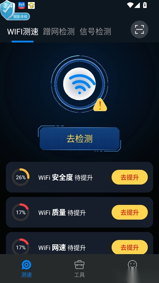 信号强度测试支持一键查看,Wifi信号测试配有动画图标,展示效果生动清晰。