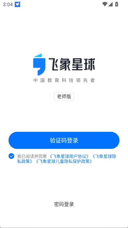 打开飞象星球老师版应用,先勾选《用户协议》,接着输入手机号并填写收到的短信验证码,之后系统会自动跳转至下一步操作。